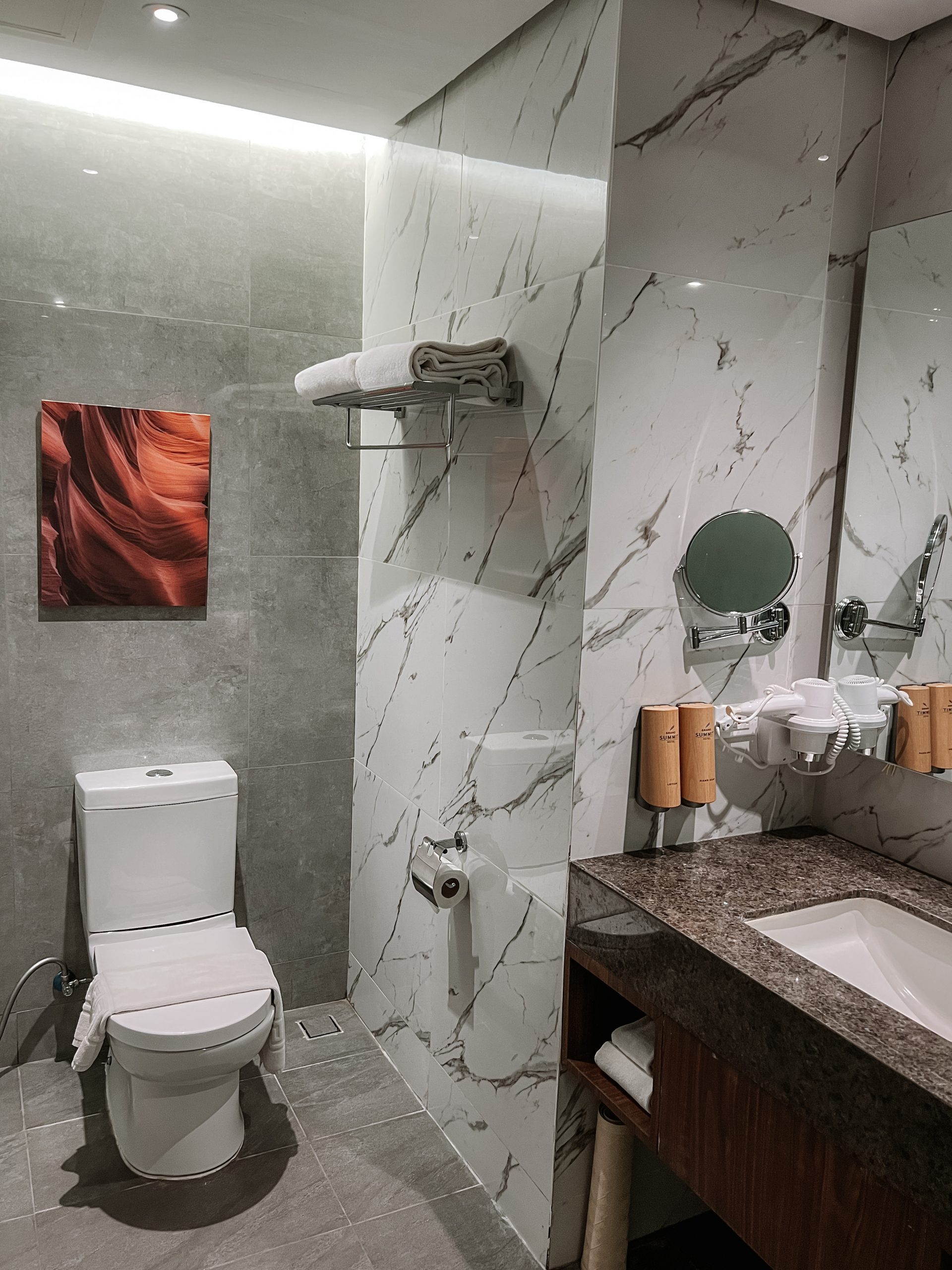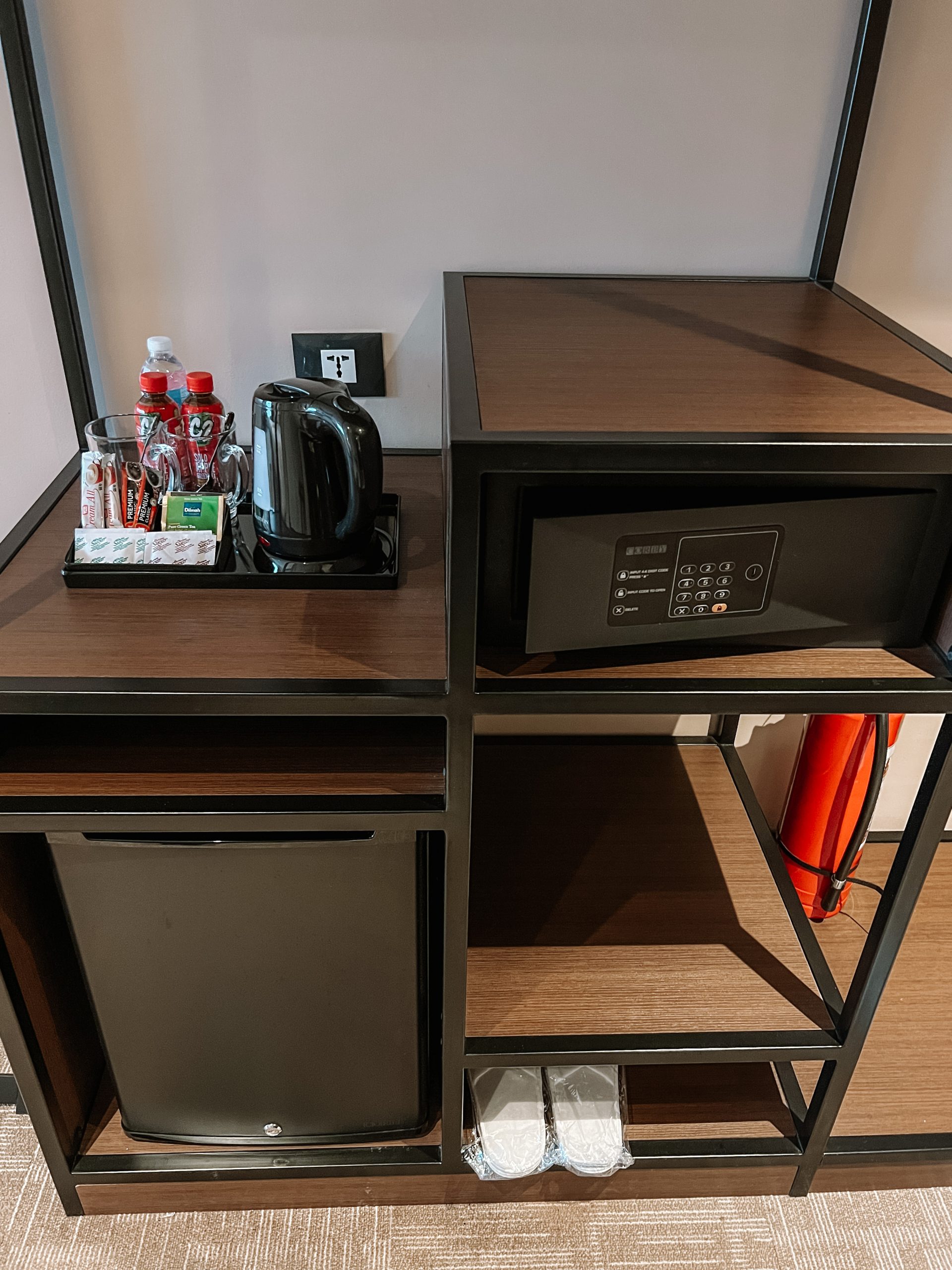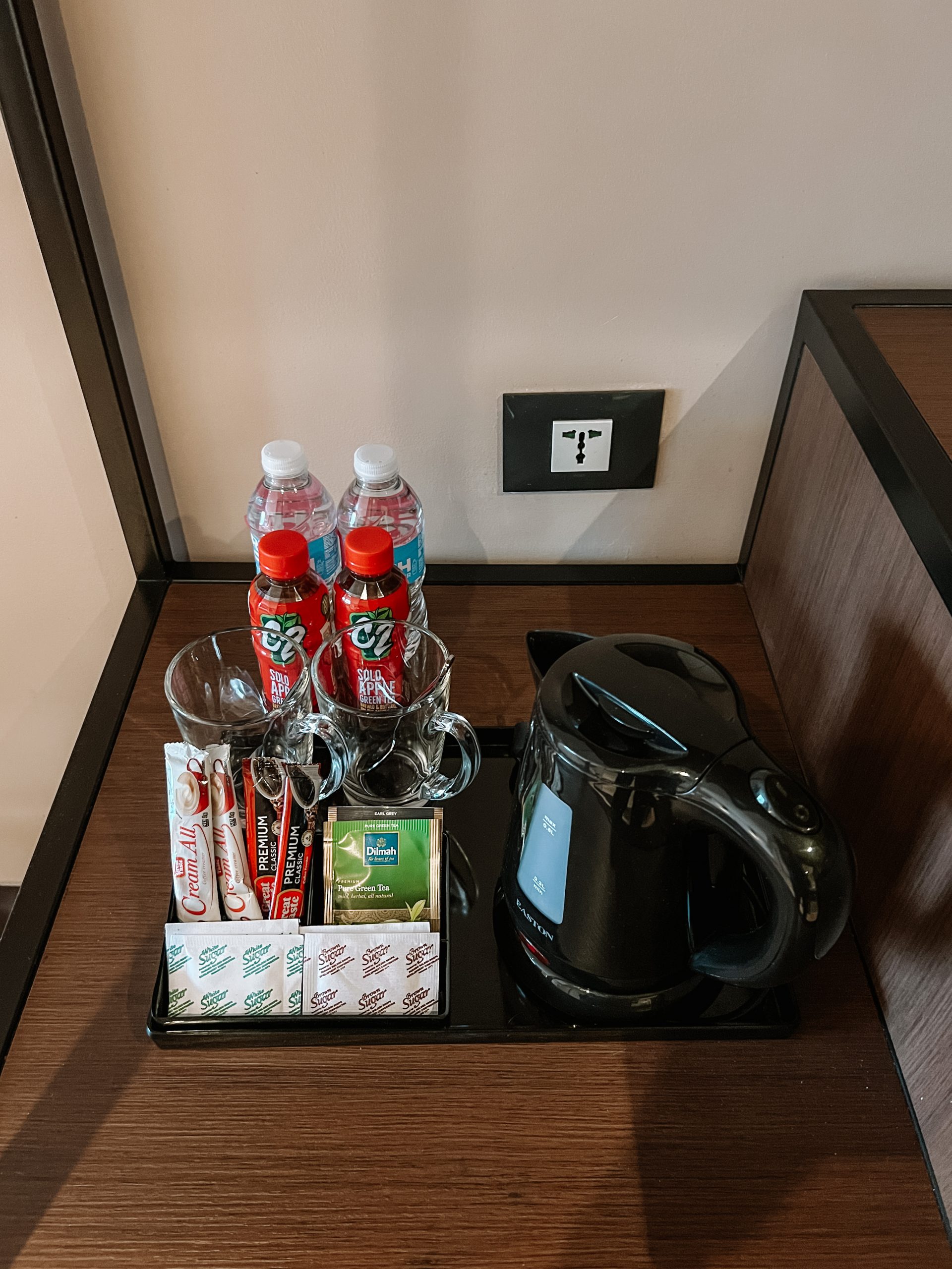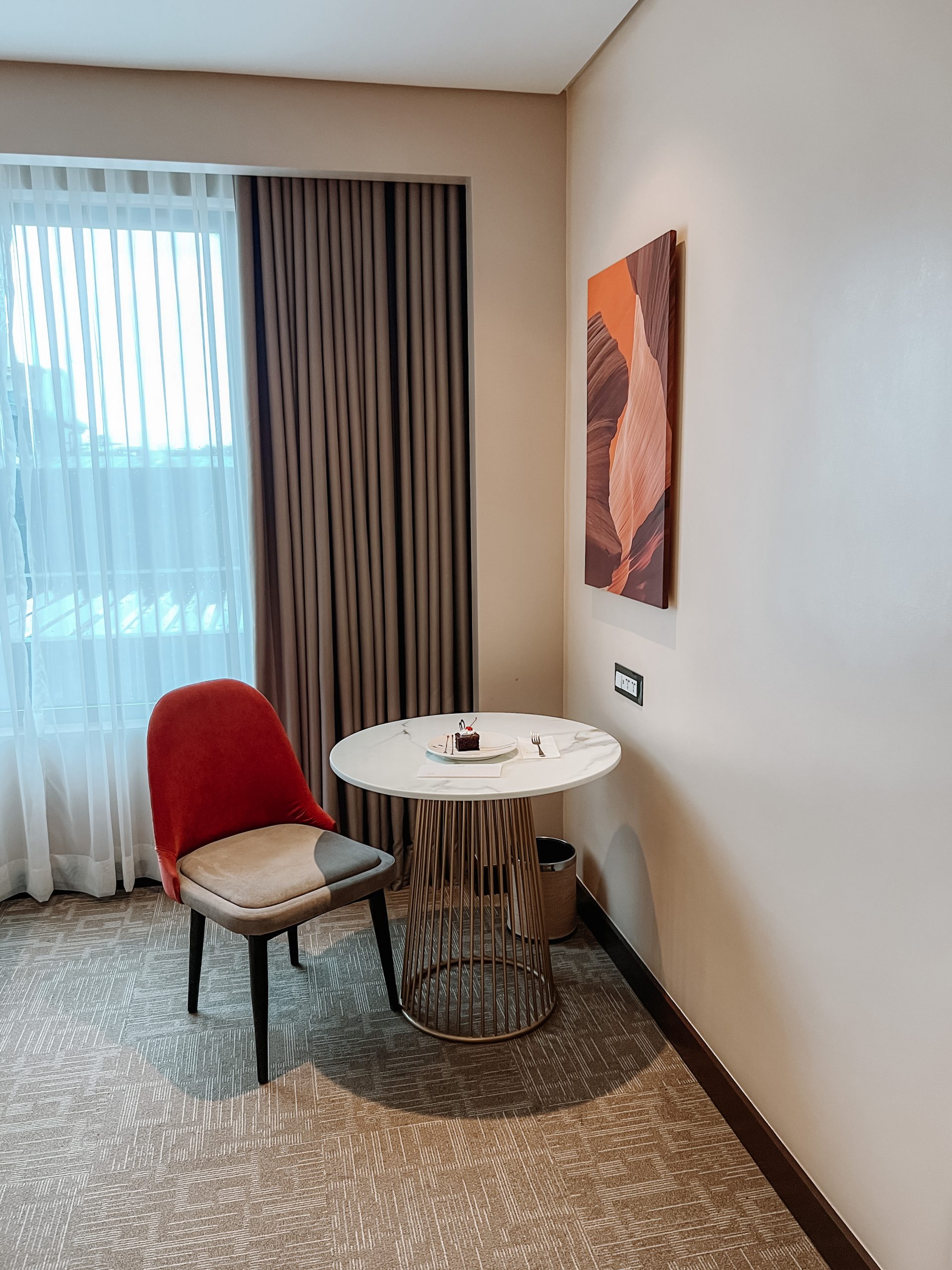 I loved the bed! It was so comfortable. The linens and duvet covers felt premium. The pillows were comfortable but could be improved. Nonetheless, my sleep here was good. On each side of the bed, there are sufficient desk-level power and USB outlets for all our gadgets, definitely a sign that this is a modern hotel. Across the beds is a 43-inch flat screen cable TV. By the window was a lounge chair on one side, and a chair and table, which could double as a work desk as it also had power outlets beside it, on the other. On the table was a slice of cake, the hotel’s sweet gesture of welcoming us.