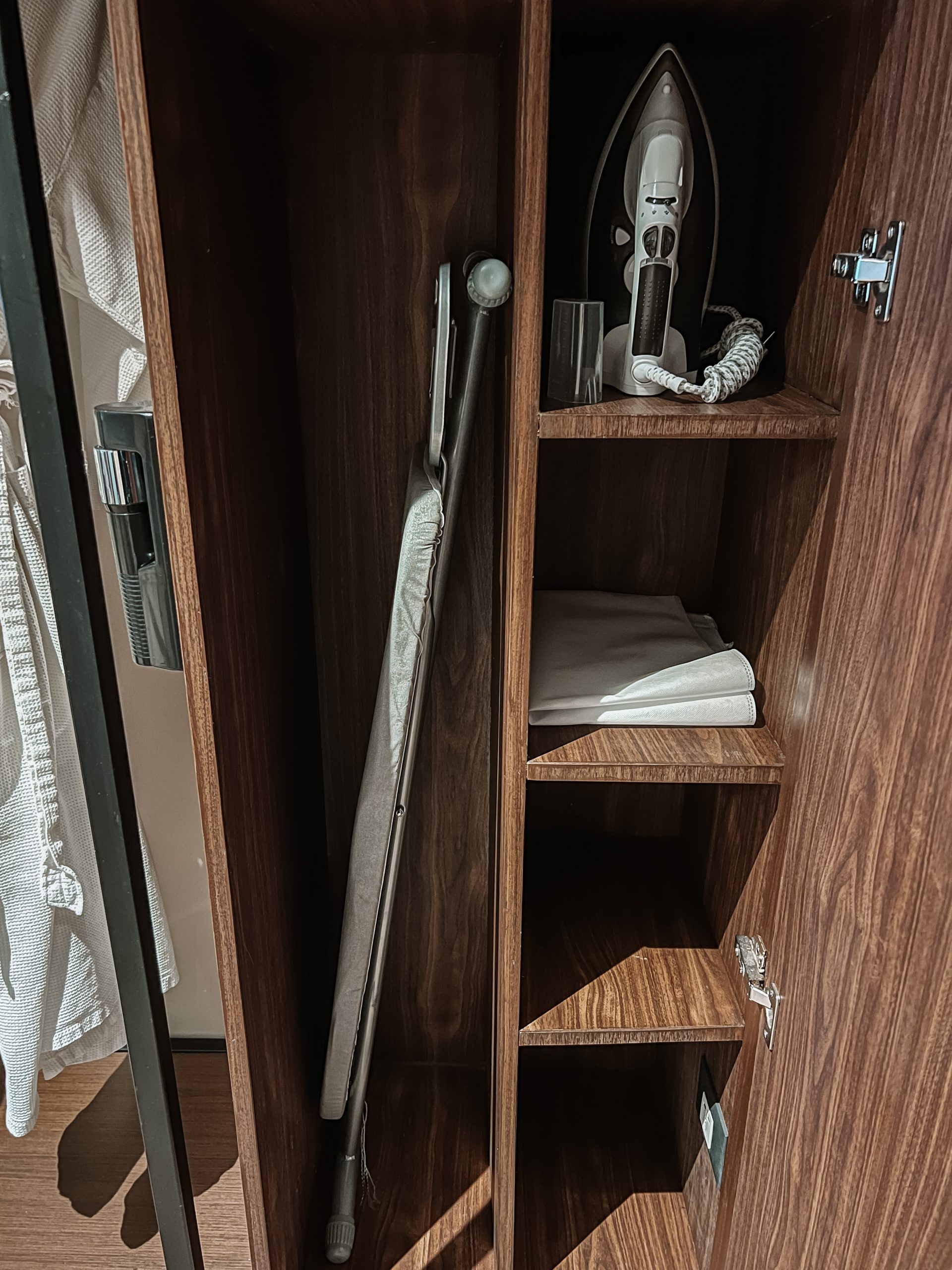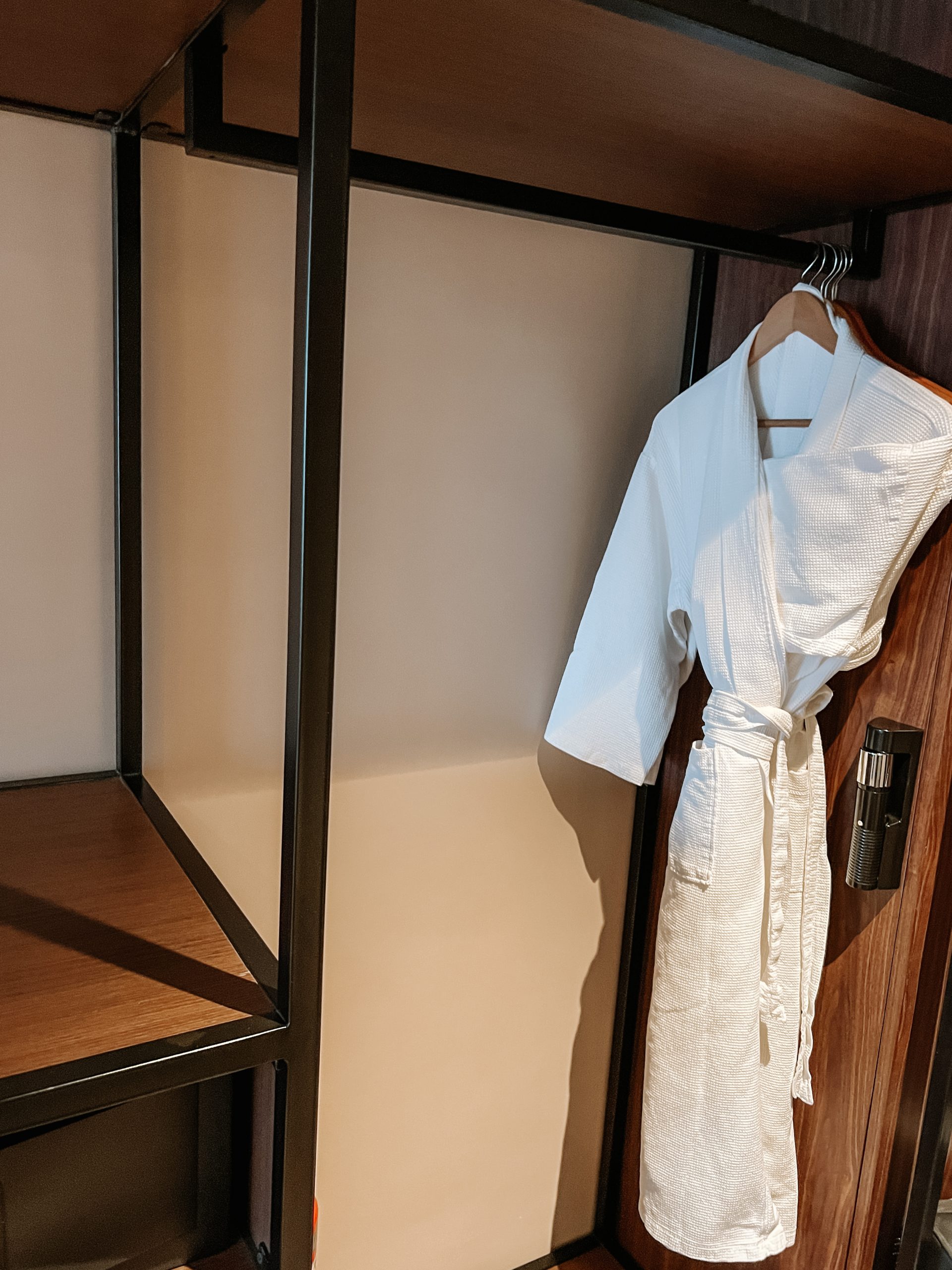 To the right of the entryway were the mini-refrigerator, complimentary instant coffee and tea, electric kettle, complimentary water bottles, C2, in-room slippers, in-room safe, open closet with hangers, bath robes, emergency flashlight and a closet with an iron and ironing board. It was interesting to see a fire extinguisher by the closet. I was assuming it’s a requirement before an occupancy permit is issued but it’s the first time I encountered such in a hotel room.